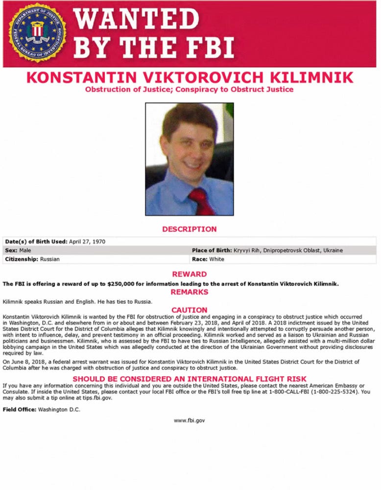 As of 2025, the FBI still lists Konstantin Viktorovich Kilimnik as wanted for obstruction of justice and conspiracy to obstruct justice in the United States v. Manafort case.