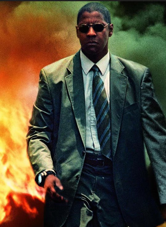 Denzel Washington walking and looking very confident in the 2004 movie, Man on Fire.