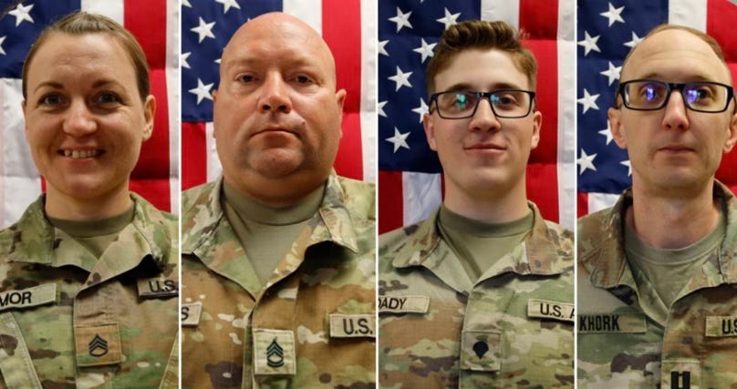 The Pentagon later released their names and photos: Sgt. 1st Class Nicole Amor, Sgt. 1st Class Noah Tietjens, Sgt. Declan Coady, Capt. Cody Khork.