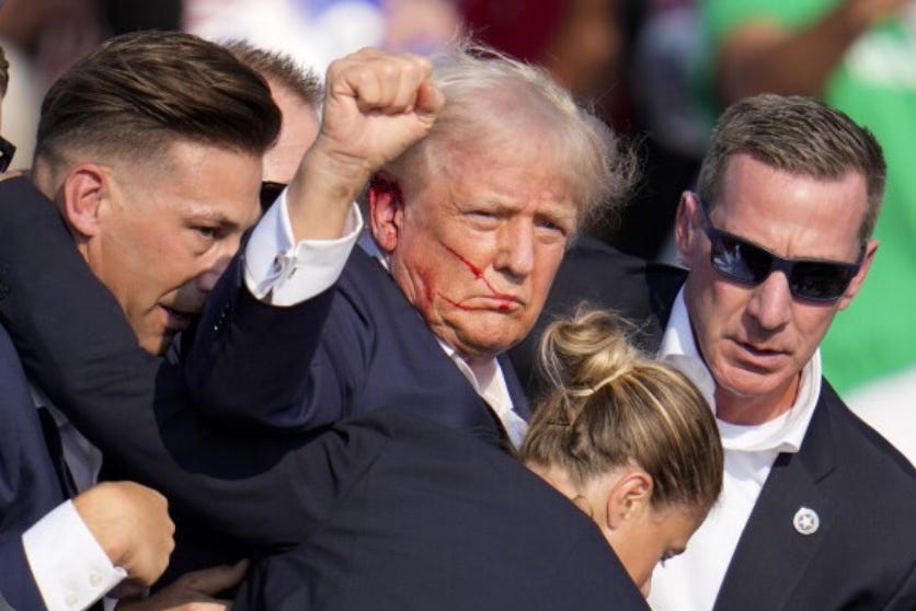 Trump’s ear is bloodied. Cameras catch it. The image rockets around the globe. But let’s look closely: