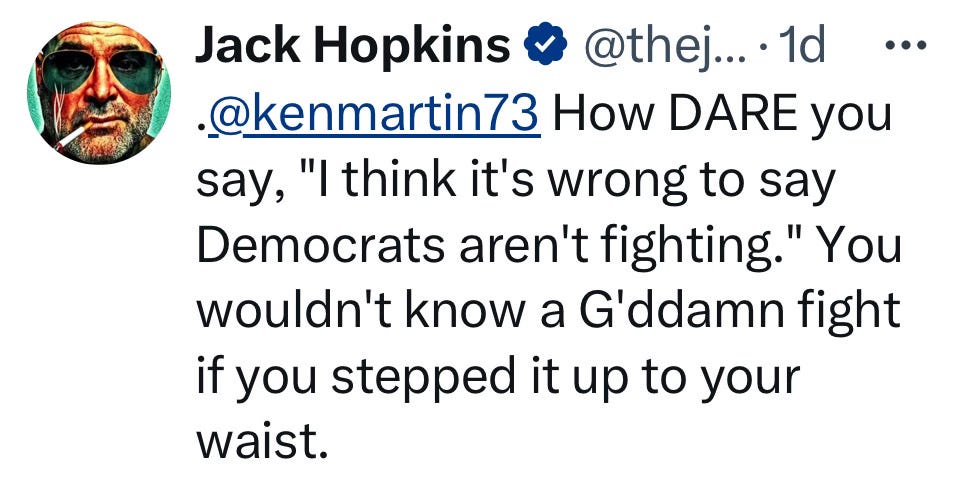 “Jack, are you taking it out on Republicans as well?” Seriously. If you have any doubts… come hang out on X for a day or two. I’m brutal.