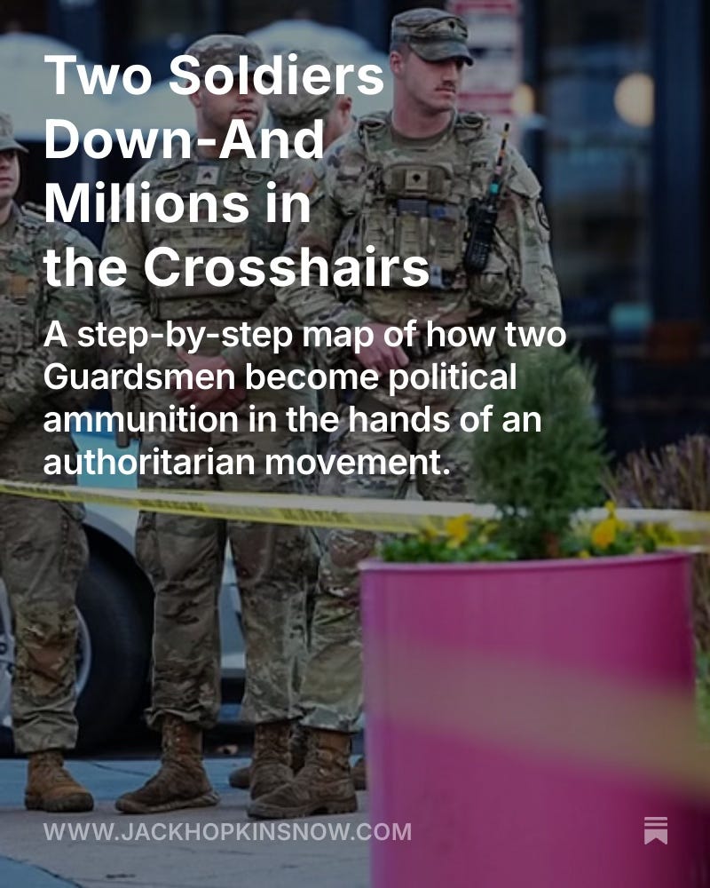 A step-by-step map of how two National Guardsmen become political ammunition in the hands of an authoritarian movement.