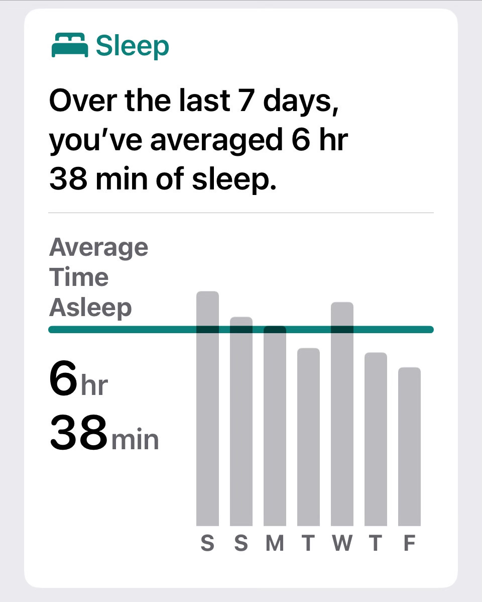 I’m putting my money where my mouth is, so to speak. Below is this morning's snapshot of my sleep over the last seven days. I track it….always. I aim for seven hours a night.