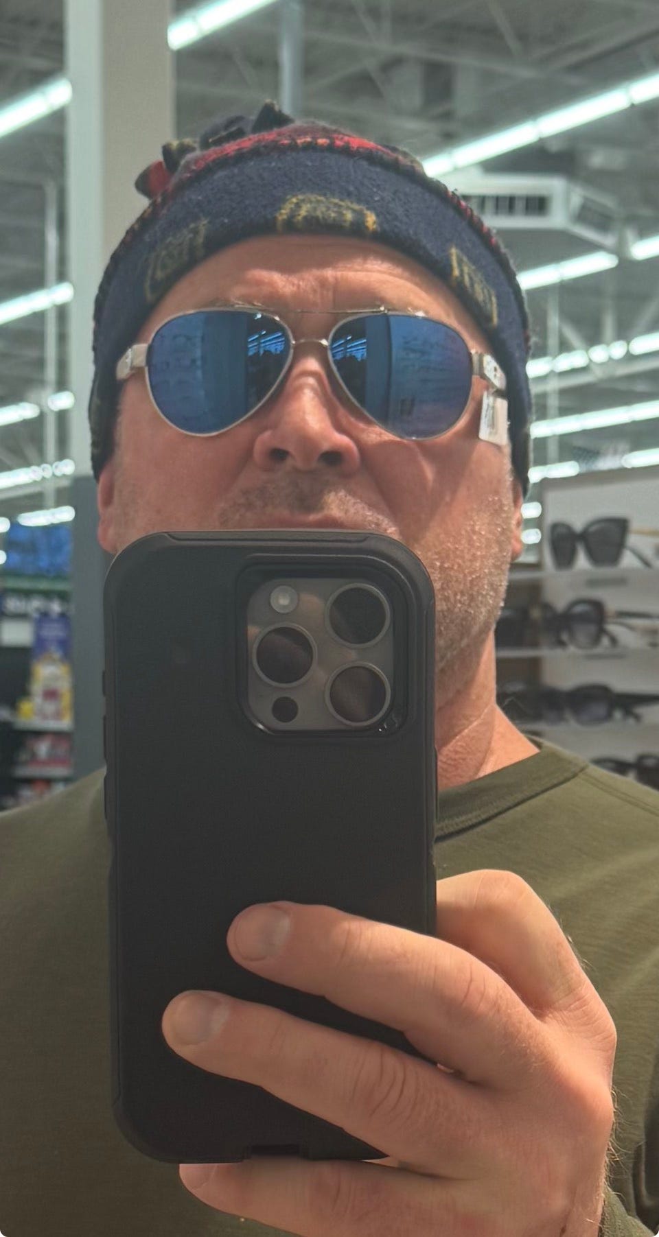 Playfully trying on aviator sunglasses just before Christmas; aviators like the digital glasses in my profile picture. I’ve never actually owned a pair…and…still don’t. But…who knows? ;)